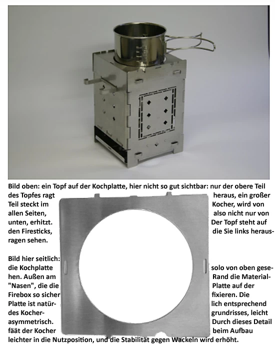 Die Kochplatte für die Firebox passt wackelfrei und herunterfallsicher (durch ´Nasen´ an der Seite, die in entsprechende Aussparungen auf der Oberseite der Firebox passen) exakt auf die Oberseite der Firebox.