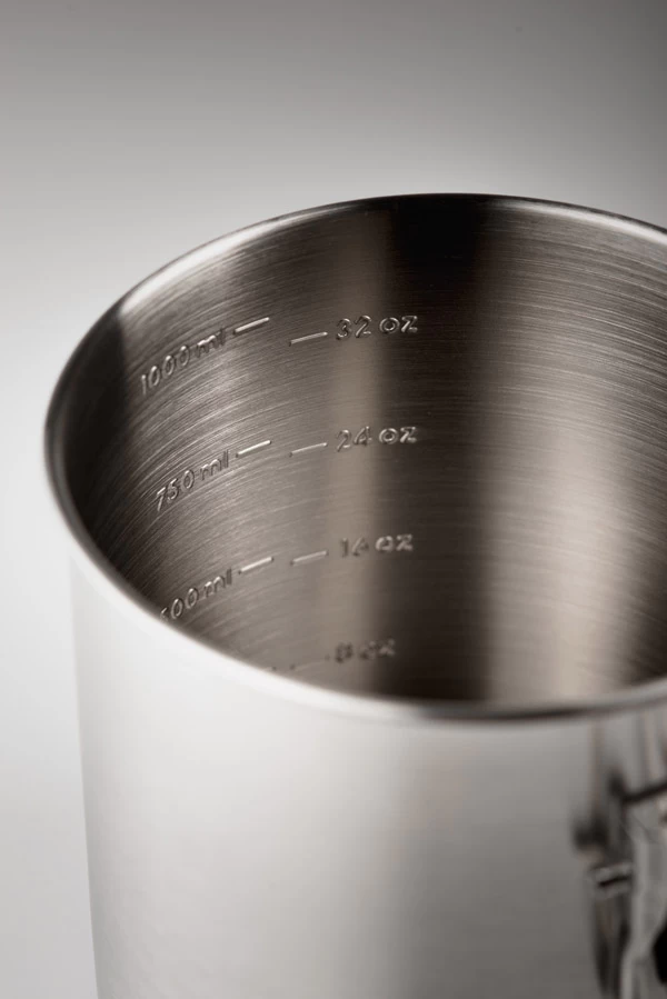 - Seitlich eingestanzte Volumenangaben in ml und fl oz. Natürlich von innen seitenrichtig, denn man kontrolliert ja den Flüssigkeitsstand innen