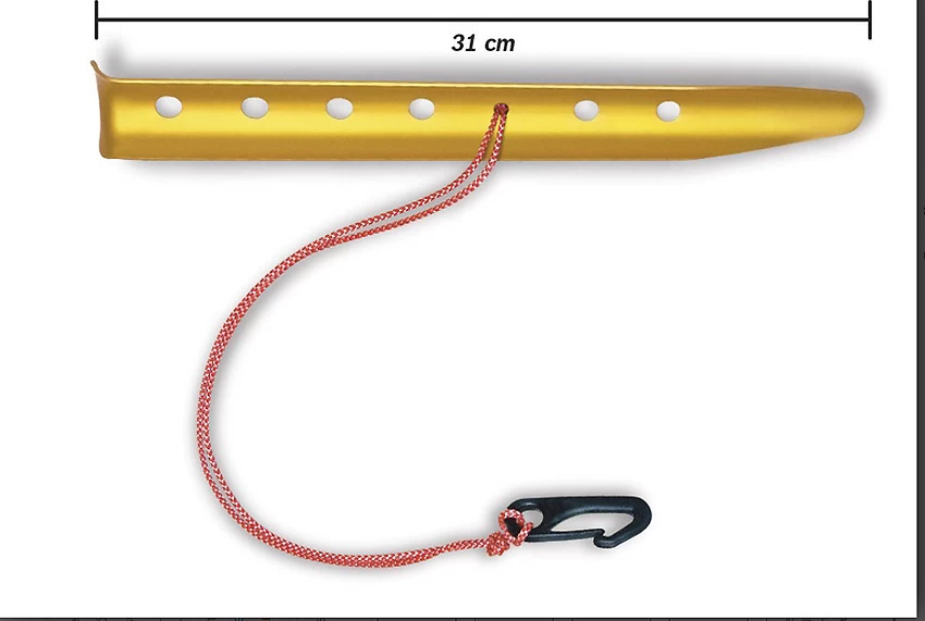 - Eine integrierte Leine mit Haken ermöglicht den Hering entweder quer zur Abspannrichtung in Schnee oder Sand einzugraben oder wie einen normalen Hering senkrecht einzusetzen.