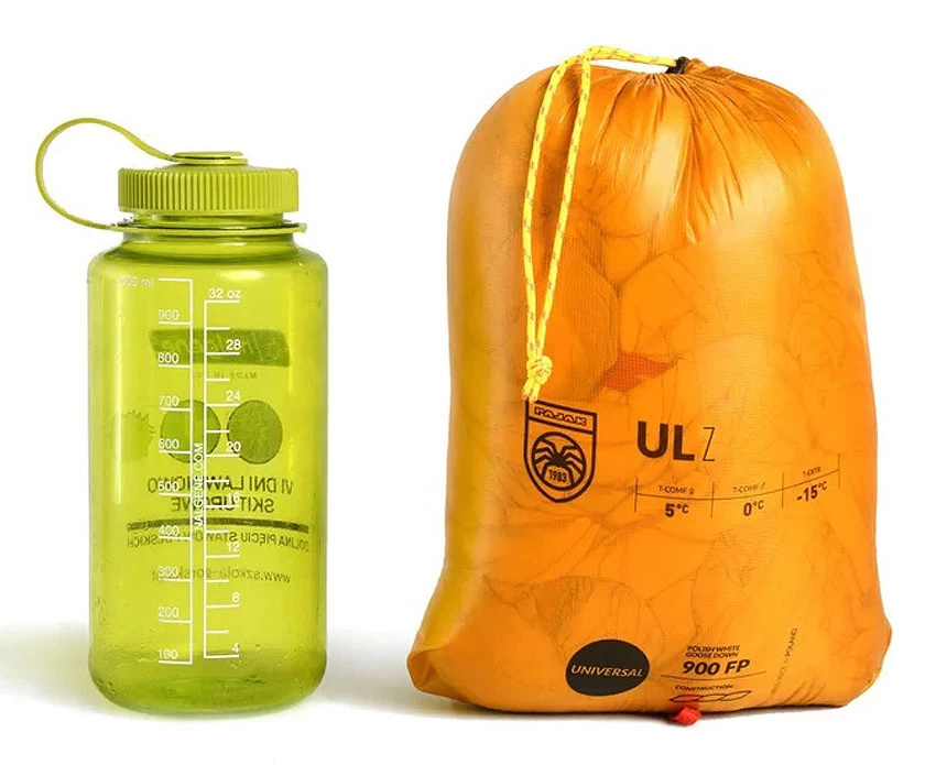 Der Pajak Radical ULZ ist ein ultra-leichter Schlafsack für Spezialisten – erfahrene UL-Nutzer setzen diesen 3/4-langen Schlafsack zusammen mit einer Wärmejacke ein (die sie im Zweifel sowieso als Teil der UL-Ausrüstung dabei haben). Diese Art der Konstruktion und die genutzten Materialien machen diesen Schlafsack, der für die genannten erfahrenen Nutzer komfortabel bis 5°C geeignet ist, nur 325 g leicht bei einem Volumen von 1.4 l – sehen Sie das Vergleichsbild zu einer Trinkflasche.