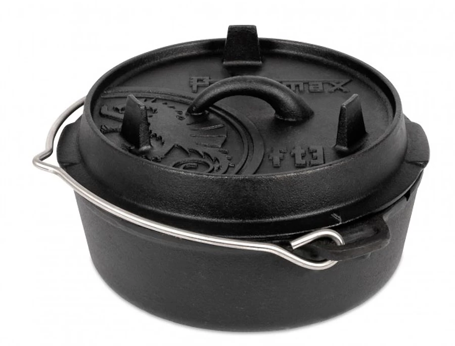 Der Petromax Feuertopf ist von der Bauart her ein klassischer Dutch oven. Also (s. auch Wikipedia) ein dreibeiniges Gefäß aus Gusseisen, das unter diesem Namen in den USA und in Australien seit dem 18. Jahrhundert sowohl zum Kochen als auch zum Braten und Backen über offenem Feuer bzw. in der Glut eines Feuer verwendet wurde. Dies ist eine Version ohne „Beine“ oder „Füße“. Handlicher, wenn der Topf im Backofen genutzt wird oder auf einem Ofen. Bei Einsatz im offenen Feuer sollte ein Gestell darunter genutzt werden, damit der Topf plan steht und nicht kippt.