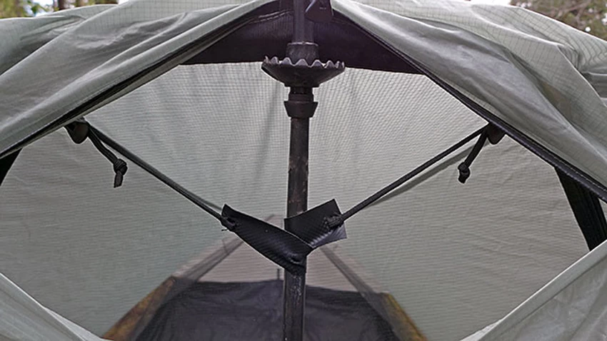 - im hinteren Bereich verhindern zwei seitlich abgespannte Mesh-Segmente, das man mit dem Schlafsackfußende ans Zeltgewebe kommt