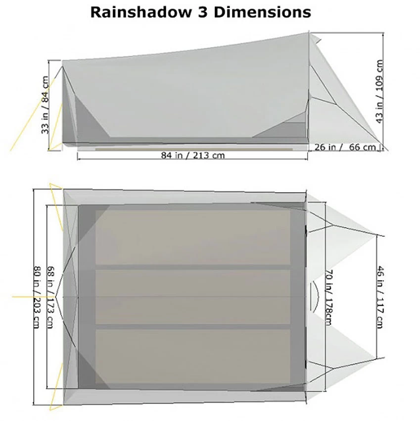 - Maße auch für lange Menschen ausreichend gross – sehen Sie den Grundschnitt in der zweiten Abbildung. Das Zelt ist vorne breiter als hinten.