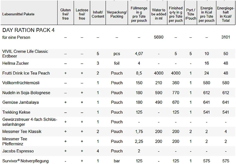 Das „Day Ration Pack“ ist ein individuell zusammengesetztes Verpflegungspaket für eine Person für 1 Tag. Die Basis der Pakete ist das Trek’n Eat Portfolio mit gefriergetrockneten Mahlzeiten – sehen Sie die einzelnen Mahlzeiten auch dort. Durch Gefriertrocknung wird den Nahrungsmitteln von Trek’n Eat der Wasseranteil vollständig entzogen, ohne dabei wichtige Vitamine