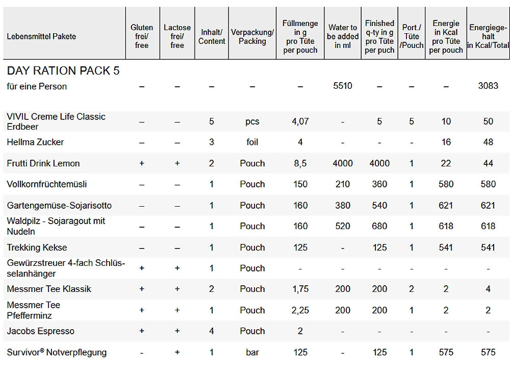 Für Notfall-Vorräte oder bushcrafter die ihr Essen outdoors nicht gross planen wollen: eine komplette Tagesration (ausser Wasser). Im Militärbereich auch als EPA bekannt. Und aktuell wegen der weltpolitischen Geschehnisse leider langfristig nicht zu bekommen. Nur was lagernd ist können wir liefern.